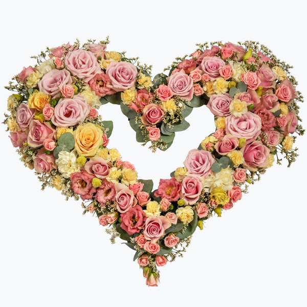 Et vakkert åpent blomstrende hjerte i delikate pasteller. En hilsen som utrykker kjærlighet i et siste fravel. Vis mer