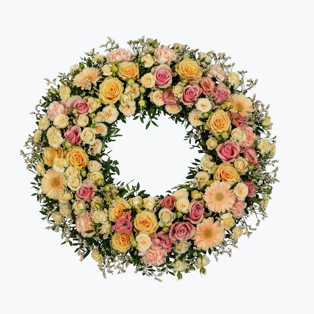 En delikat og vakker siste hilsen til båren i sarte fargetoner. Denne frodige kransen består av ulike nydelige blomster som hører til årstiden.